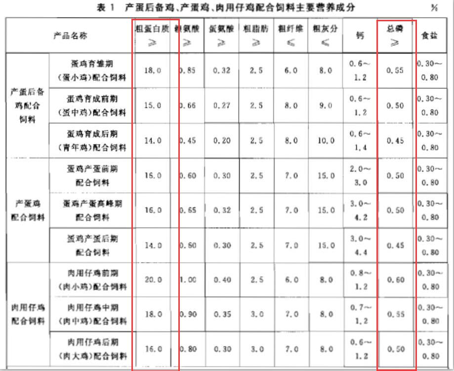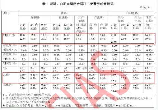 对比蛋鸡、肉鸡的标准不难发现,和猪一样,虽然粗蛋白和总磷增设了上限,但是同样我们比较下限,粗蛋白指标下调的幅度也不超过2%,很多阶段粗蛋白下限不变,如育成期和产期前期;而肉鸡的粗蛋白下限基本没变,只是团体标准中增加了一个0-10日龄的阶段划分。
