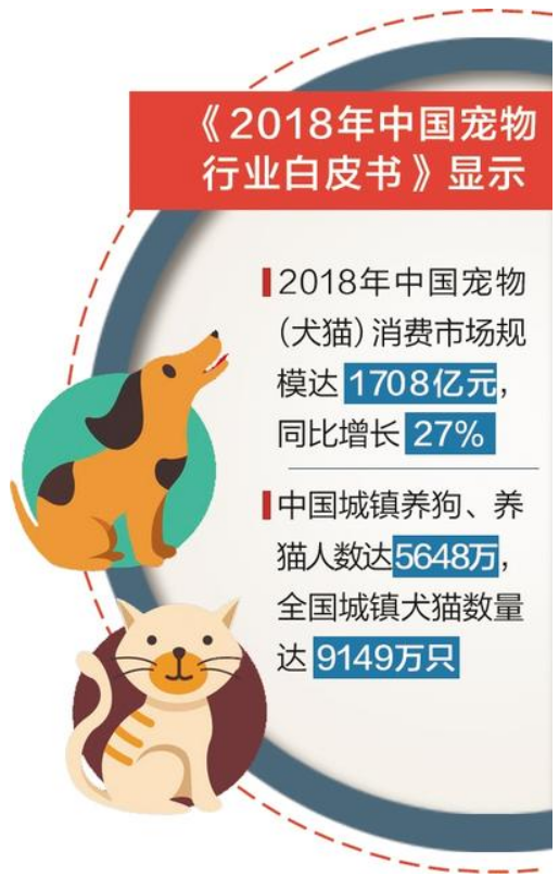 近日发布的《2018年中国宠物行业白皮书》显示,2018年中国宠物(犬猫)消费市场规模达1708亿元,同比增长27%。中国城镇养狗、养猫人数达5648万,全国城镇犬猫数量达9149万只。