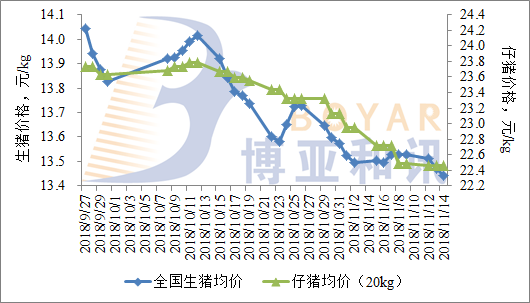 据博亚和讯监测,2018年11月14日全国外三元生猪均价为13.44元/kg,较昨日下跌0.03元/kg;仔猪均价为22.46元/kg,较昨日持平;今日白条肉均价18.02元/kg,较昨日下跌0.05元/kg。今日猪料比价为4.94:1,较昨日减少0.01。