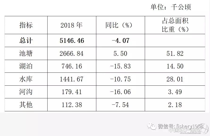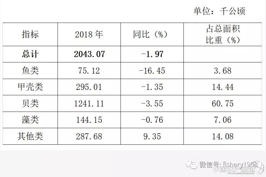 全国水产养殖面积7189.52千公顷,同比下降3.48%。其中,海水养殖面积2043.07千公顷,同比下降1.97%;淡水养殖面积5146.46千公顷,同比下降4.07%;海水养殖与淡水养殖的面积比例为28.4:71.6。