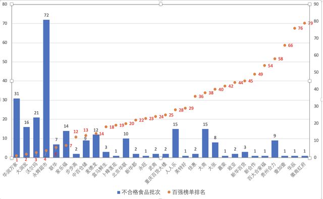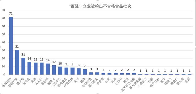 除了永辉超市(百强榜第4)、华润万家(百强榜第1)、沃尔玛(百强榜第3)、大润发(百强榜第2)被检出的不合格食品批次占据半壁江山外,其后依次为:人人乐(15批次)、大商(15批次)、家乐福(14批次)、麦德龙(12批次)、北京华联(10批次)、中百仓储(9批次)、贵州合力(9批次)、大张(8批次)、联华(7批次),新华百货和盒马鲜生各3批次,欧亚、重庆百货大楼、新华都、武商、佳惠和步步高各2批次,永旺、壹加壹、新合作、美特好、嘉荣、徽商红府、华辰、卜蜂莲花和百大合家福各有1批次食品被抽检不合格。