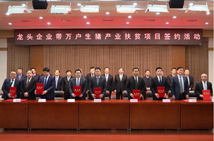 12月26日,农业农村部会同国务院扶贫办在京举行“龙头企业带万户生猪产业扶贫项目”集中签约活动。15个生猪养殖龙头企业与湖北恩施州、四川凉山州等16个市(州)政府签订了生猪产业发展合作协议,集中签约项目19个,计划总投资近500亿元,建成投产后,可新增年出栏生猪2200万头的产能,带动贫困地区3.3万农户发展生猪养殖及相关产业。农业农村部部长韩长赋、国务院扶贫办副主任陈志刚出席签约活动并讲话。