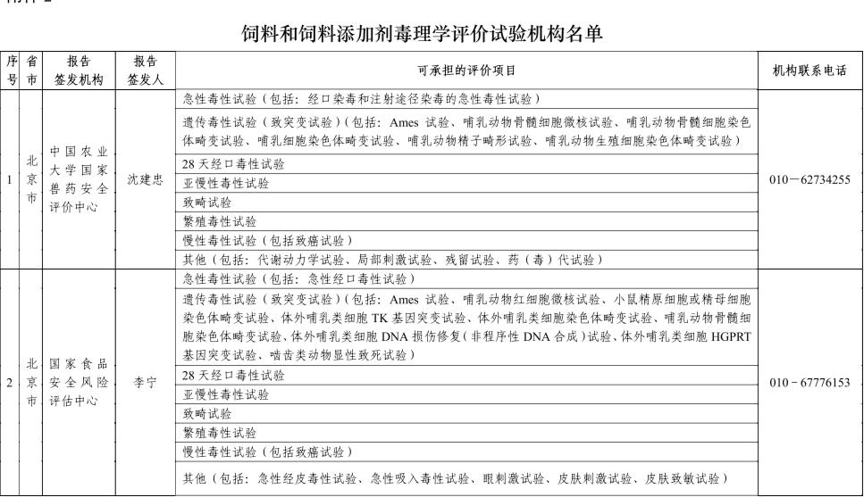 根据公告 279号 ,为进一步规范新饲料和新饲料添加剂审定工作,落实“放管服”要求,增加行政审批相对人的选择余地,农业农村部委托全国饲料评审委员会对有关评价机构进行了评估,确定了25家有能力承担饲料和饲料添加剂有效性和耐受性评价试验机构和9家毒理学评价试验机构,如下: