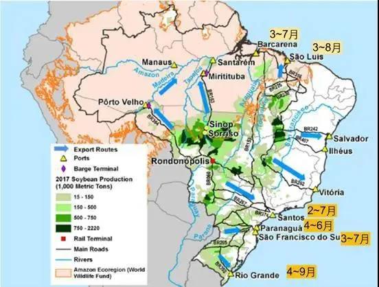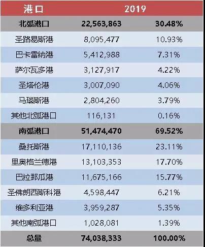 巴西国内港口按照区域,划分为北弧港口和南弧港口,北弧港口中的圣路易斯港、巴卡雷纳港等位于北部诸州,而巴西大豆出口三大港则位于南弧港口圈,分别是桑托斯港、里奥格兰德港、巴拉那瓜港。