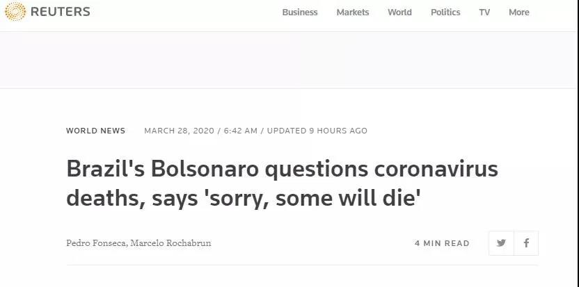 “抱歉,一些人会死去,他们确实会死去,这就是人生”,巴西总统博索纳罗在接受电视台采访时说,“你不能因为交通事故会出人命就要求汽车制造厂停工”。