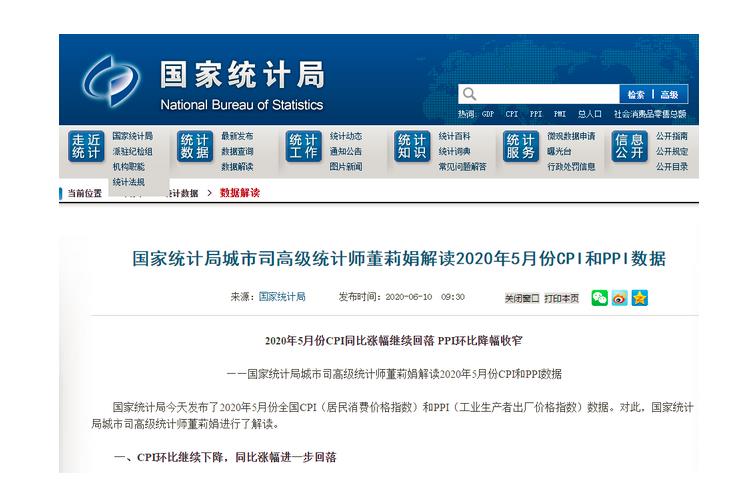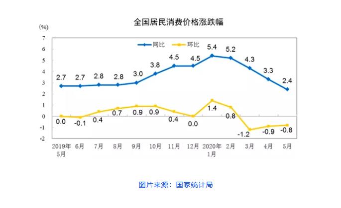 6月10日,国家统计局公布2020年5月份全国CPI和PPI数据。5月,全国CPI上涨2.4%。其中,食品价格上涨10.6%,非食品价格上涨0.4%;消费品价格上涨3.3%,服务价格上涨1.0%。5月份CPI在时隔8个月后重回“2时代”。