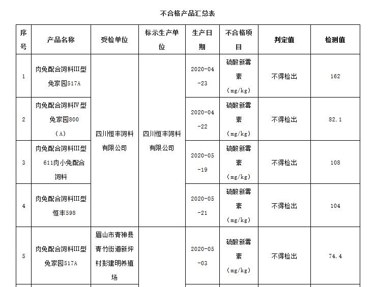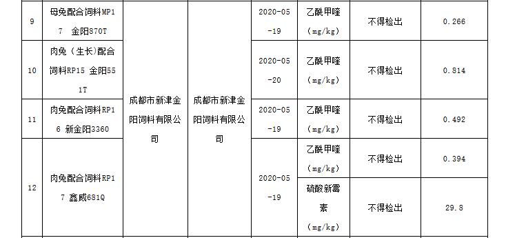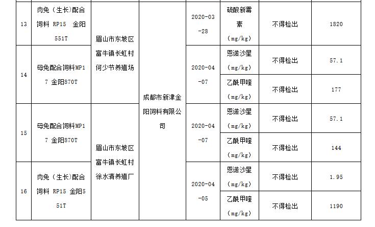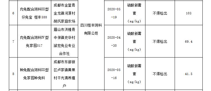 经检测,成都市新津金阳饲料有限公司生产的4批次兔用饲料、四川恒丰饲料有限公司生产的4批次兔用饲料和部分养殖场使用的标识生产企业为上述两家公司的8批次兔用饲料检出国家未允许在商品饲料中添加的药物。