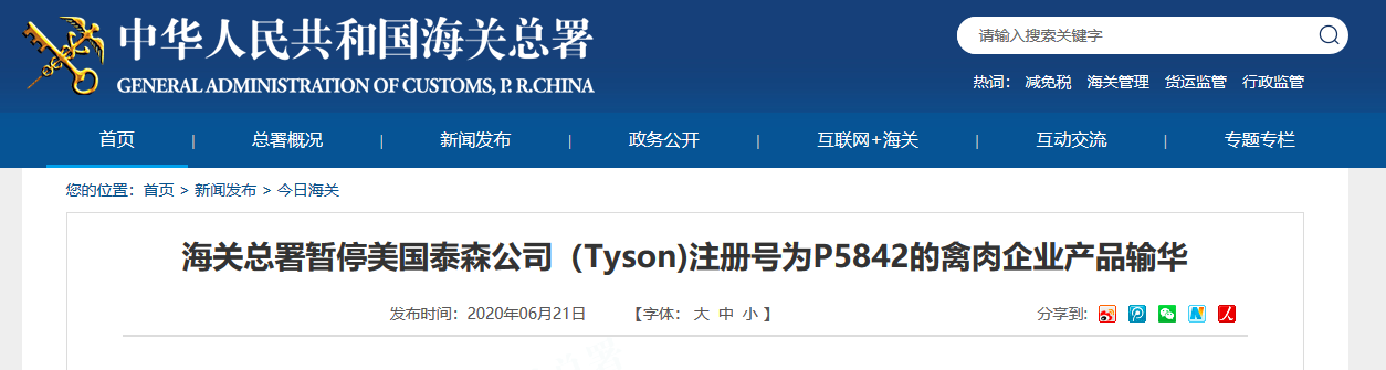 海关总署暂停美国泰森公司(Tyson)注册号为P5842的禽肉企业产品输华