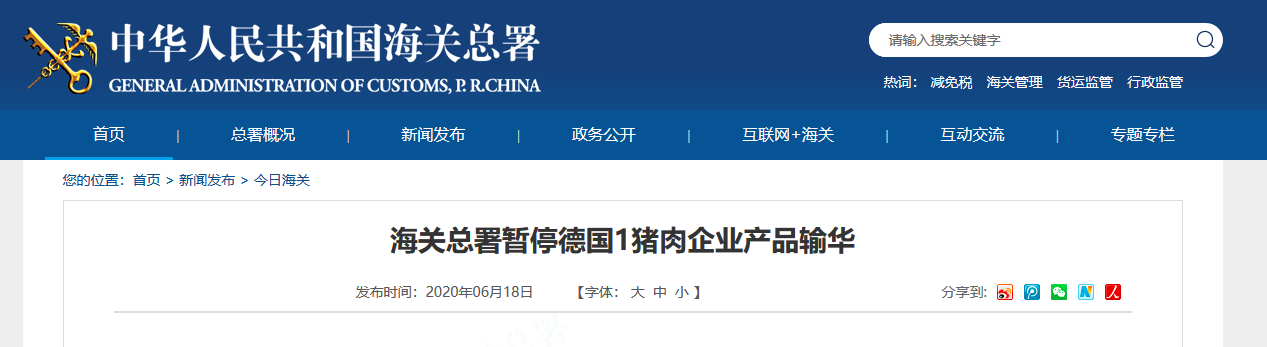 自6月17日起,中国海关暂停德国1家猪肉屠宰及其分割、冷藏企业的产品输华。