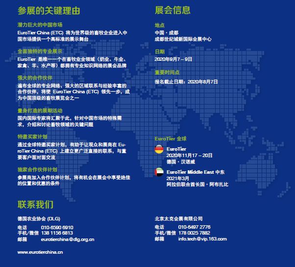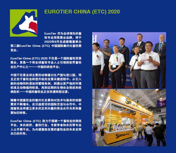 2020年9月7-9日,由全国畜牧总站和德国农业协会联合主办的 EuroTier CHINA (ETC 2020)中国国际集约化畜牧展览会将在成都世纪城新国际会展中心举办!预示着中德经贸往来将开启正常化进程。