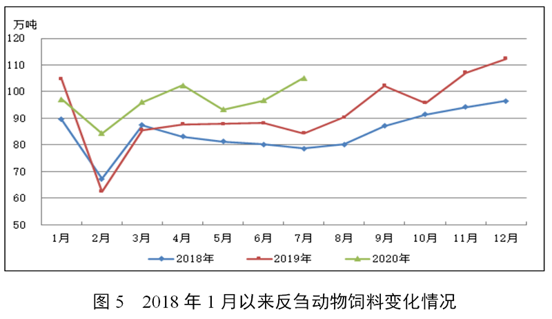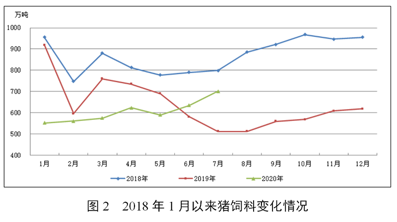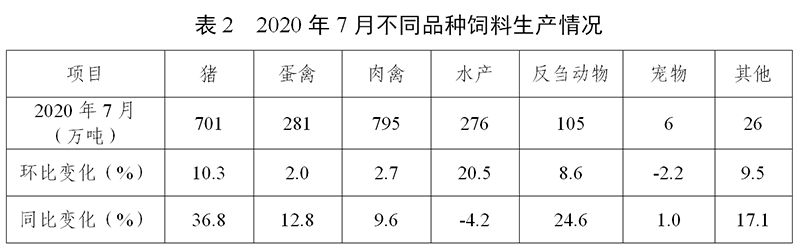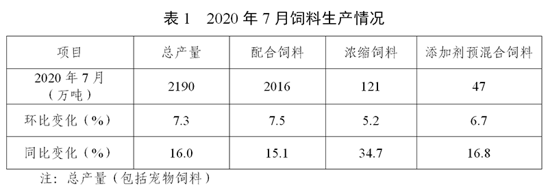 据截至8月6日已填报企业测算,2020年7月,饲料总产量2190万吨,环比增长7.3%,同比增长16.0%。从趋势上看,今年3月、4月和6月、7月饲料总产量环比增长,7月环比较上月扩大5.1个百分点;2月以后,除3月份同比小幅下降外,其余各月份产量均比上年同期有所增长,7月饲料产量达近三年的高位水平,高于2017年以来的月度平均产量。