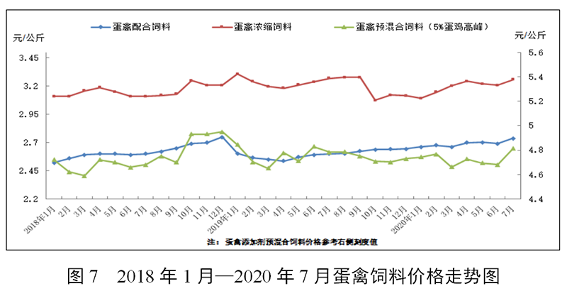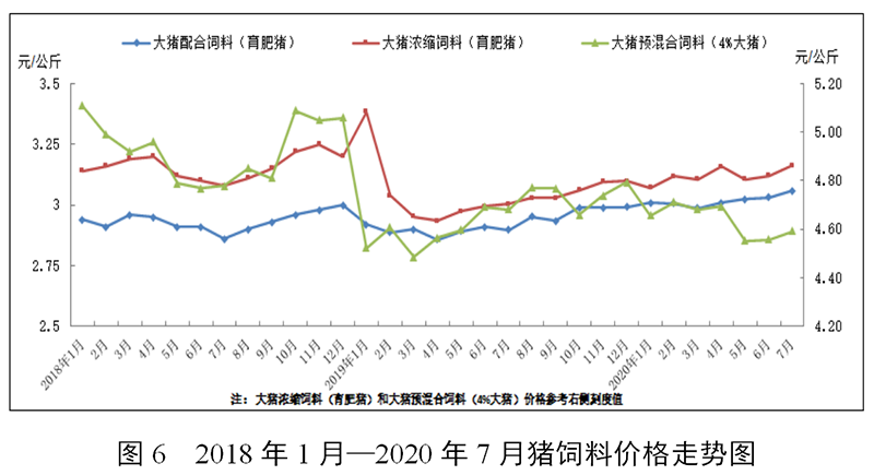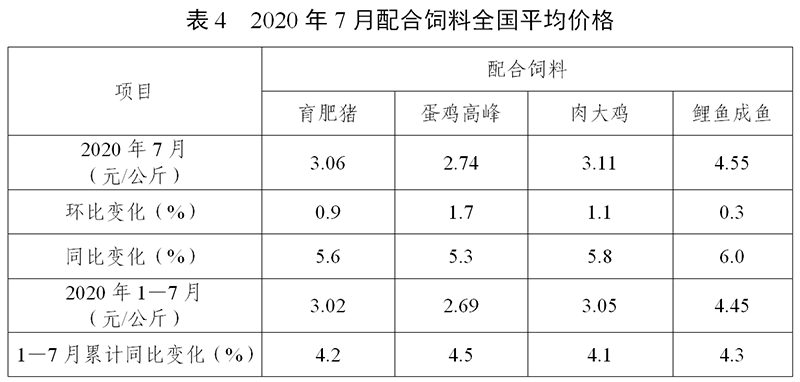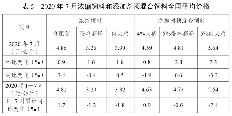 7月份,因玉米价格持续上涨,带动麸皮等能量饲料原料价格上涨,配合饲料价格普遍上涨,主要饲料品种价格比上年同期上涨5.3—6.0个百分点。豆粕价格偏强震荡,带动蛋白饲料原料价格不同程度上涨,除蛋禽浓缩料同比小幅下降外,其他浓缩饲料价格比上年同期上涨0.5—3.4个百分点。预混合饲料同比以小幅下降为主。