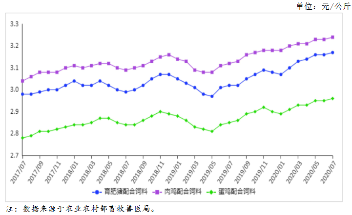 7月份育肥猪、肉鸡、蛋鸡配合饲料月均价分别为每公斤3.17元、3.24元、2.96元,环比分别涨0.3%、0.3%、0.3%,同比分别涨5.0%、3.8%、3.9%。从周数据来看,3种主要饲料产品价格连续6周小幅上涨,7月第4周,集贸市场价格分别为每公斤3.19元、3.2621元、2.98元,为2015年10月第3周以来的最高周价。