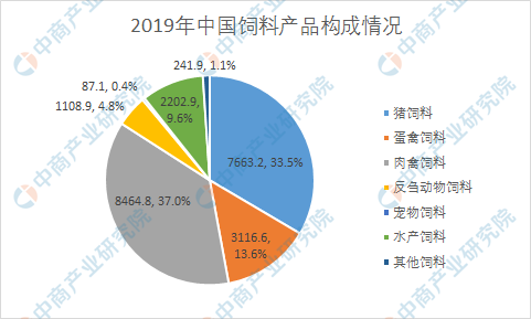 按类型来看,2019年我国配合饲料产量达21013.8万吨,同比下降3.0%;浓缩饲料1241.9万吨,同比下降12.4%;添加剂预混合饲料542.6万吨,同比下降10.6%。