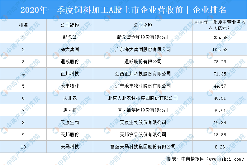 此外,据中商产业研究院大数据库显示,2020年一季度饲料工业行业A股上市企业中,新希望、海大集团、通威股份、正邦科技、禾丰牧业、大北农、唐人神、天康生物、天邦股份以及天马科技为营收前十企业。其中,新希望以营收205.68亿元位居榜首。
