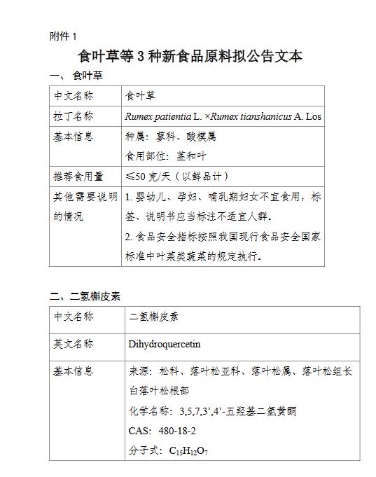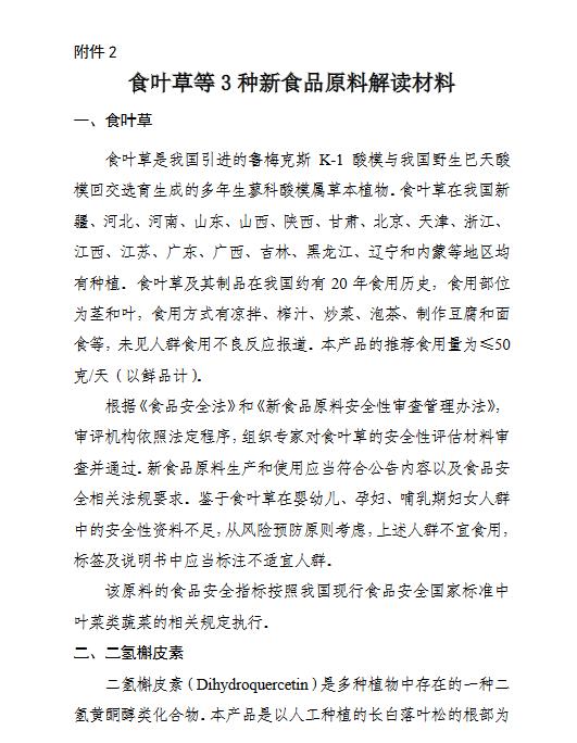 受国家卫生健康委员会委托,根据《食品安全法》和《新食品原料安全性审查管理办法》的规定,近期食叶草等3种新食品原料已通过专家评审委员会技术审查,现公开征求意见。