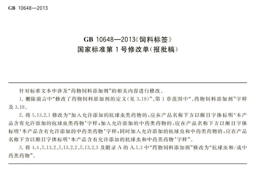 饲料标签《第1号修改单》关于药物饲料添加剂、球虫药、中药、有新规定