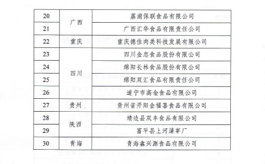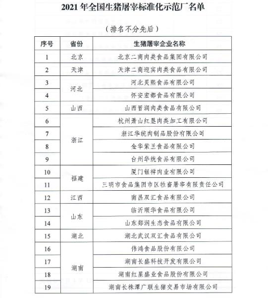 农业农村部近日公布了《2021年全国生猪屠宰标准化示范厂名单》,确定了北京二商肉类食品集团有限公司等30家企业为全国生猪屠宰标准化示范厂并颁发标牌。具体如下: