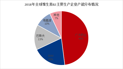 在世界饲料级维生素添加剂市场上,我国有着举足轻重的地位。饲料级维生素添加剂产业不仅支持了饲料行业的发展,而且推动了饲料行业增长模式的改变。目前,全球维生素B2主要生产企业有广济药业、巴斯夫、DSM。这三家企业产能占全球产能的80%。具体来看,广济药业年产能最高,大致在4800吨左右,占比达48%。DSM公司年产能大致在2000吨/年左右,占比达20%。巴斯夫年产能大致在1500吨左右,占比达15%。海嘉诺年产能大致在1000吨左右,占比达10%。截止2018年全球维生素B2主要生产企业产能分布情况: