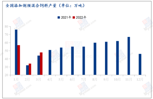 饲料产量增长,饲用维生素预混料市场仍处于开发发展阶段,我国饲料产业规模庞大,据中国饲料工业协会统计,3月份及一季度全国工业饲料产量同环比皆有所增加,添加剂预混合饲料3月份产量48万吨,环比也实现增长39.9%,但一季度产量140万吨,同比下降7.3%。