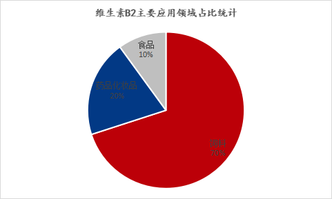 饲料是维生素B2主要用途,维生素B2的主要应用领域包括医药化妆品、食品饮料以及动物饲料,其中,饲料工业所使用的维生素约占到维生素总消费量的70%,因此饲料维生素的应用主导了我国维生素市场的发展。维生素B2主要应用领域占比统计情况: