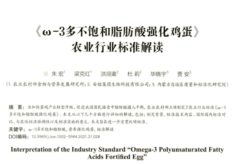 2021年12月15日,根据中华人民共和国农业农村部公告(第504号),《ω-3多不饱和脂肪酸强化鸡蛋》(NY/T 4069-2021)、《ω-3多不饱和脂肪酸强化鸡蛋生产技术规范》(NY/T 4070-2021)两项标准经专家审定,批准为中华人民共和国农业行业标准,自2022年6月1日起实施。