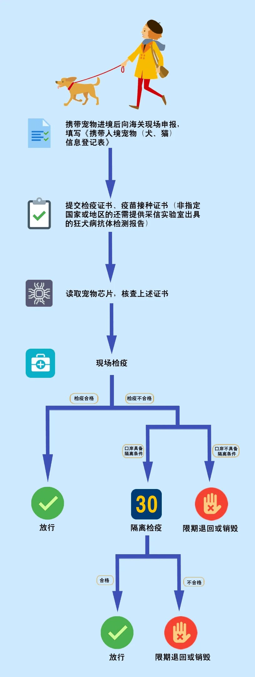 (1)对于不符合免隔离要求的宠物,须从具备进境宠物隔离检疫设施的口岸(附具体名单)入境,并在海关指定的隔离检疫场所隔离检疫30天。