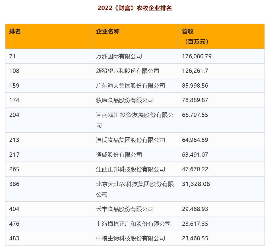 新希望、牧原、海大、禾丰、大北农...入选2022年《财富》中国500强榜单