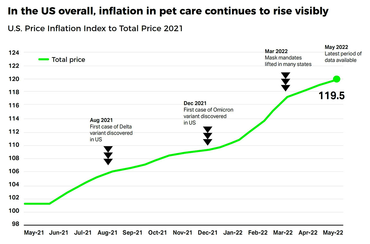 根据NielsenIQ的数据,2022年5月宠物护理总价格指数为119.5,2021上升了18.31点。这一总体趋势反映在狗粮和猫粮的价格指数中;2022年5月,狗粮指数为121.8,同比上升18.66点,而猫粮指数为118.9,同比上涨18.56点。NielsenIQ将该数据描述为“宠物必需品价格的大幅上涨”,并预计该指数将持续上升至2022年第三季度。