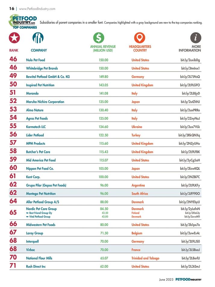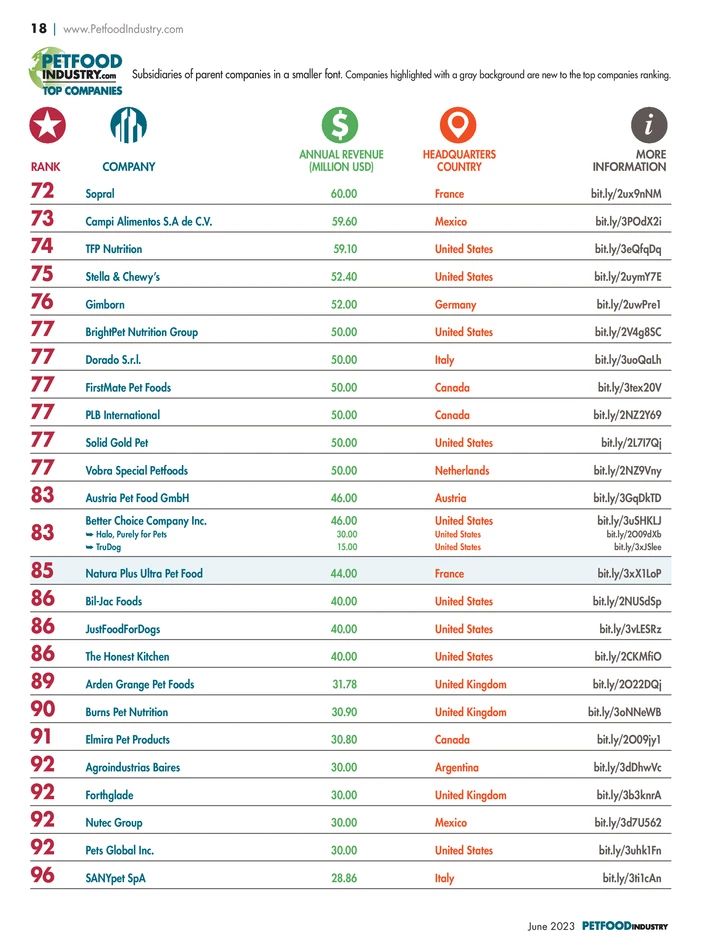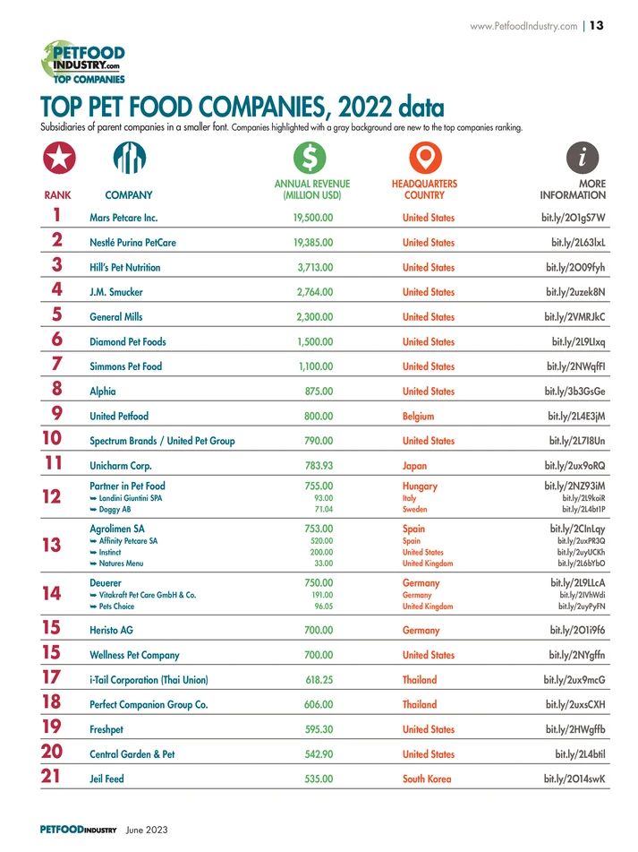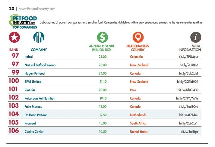 据petfoodindustry 6月杂志获悉,2022年全球宠物食品企业top106,与2021年相比新上榜了5家企业,详情如下 :