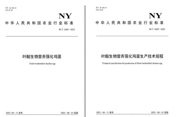 由中国农业科学院北京畜牧兽医研究所、农业农村部食物与营养发展研究所等单位共同起草的《叶酸生物营养强化鸡蛋》和《叶酸生物营养强化鸡蛋生产技术规程》2项行业标准,于8月1日正式实施。