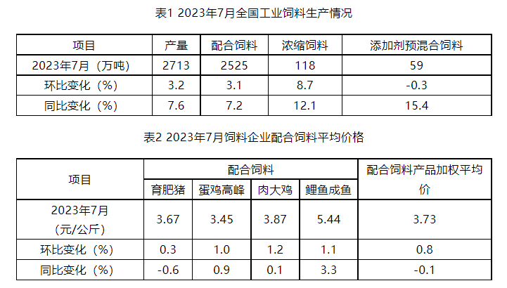 据样本企业数据测算,2023年7月,全国工业饲料产量2713万吨,环比增长3.2%,同比增长7.6%。主要配合饲料、浓缩饲料、添加剂预混合饲料产品出厂价格环比以增为主。饲料企业生产的配合饲料中玉米用量占比为25.2%,同比下降5.6个百分点;配合饲料和浓缩饲料中豆粕用量占比13.1%,同比下降2.8个百分点。