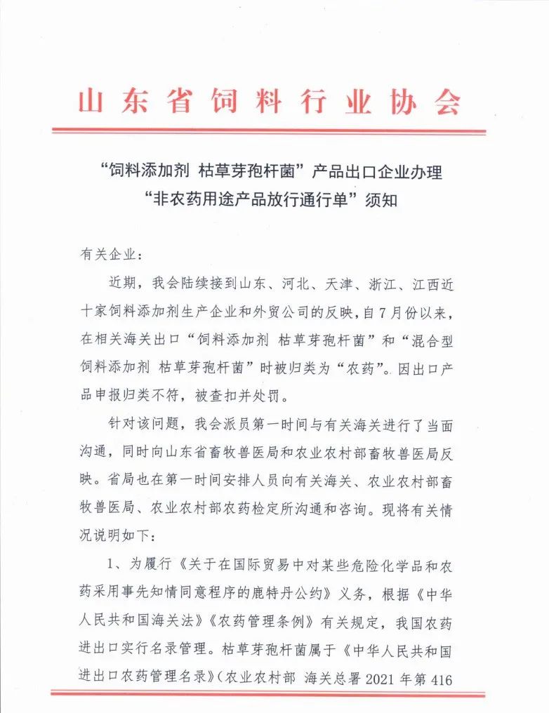 “饲料添加剂枯草芽孢杆菌”产品出口企业办理“非农药用途产品放行通行单”须知