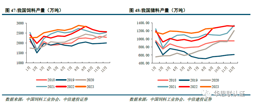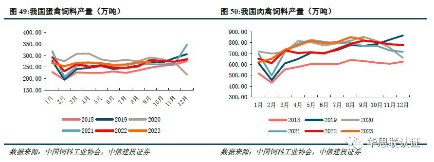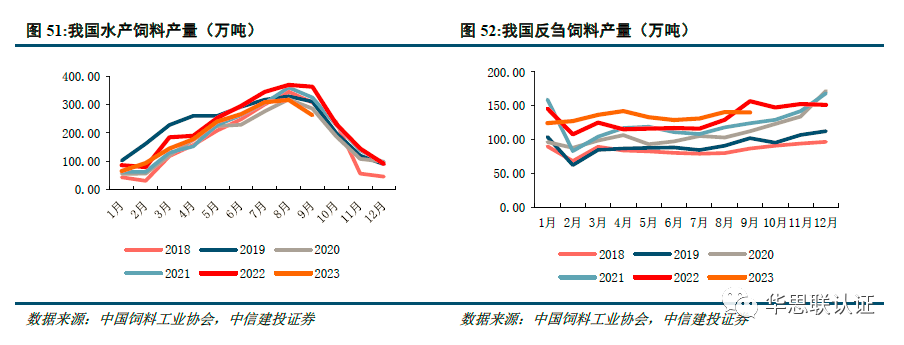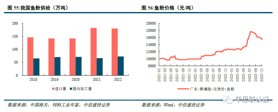 中国海关数据显示,2022 年我国鱼粉进口量 180 万吨,饲料工业年鉴数据披露国内加工量 72 万吨,结合两组数据判断,我国鱼粉对外依存度近 70%。由于鱼粉供应主要来自海外,且国内水产饲料企业在鱼粉采购中处弱势地位,鱼粉的定价权主要取决于国外。秘鲁是我国鱼粉的主要进口国,上半年受秘鲁捕捞暂停影响,秘鲁鱼粉价格大涨带动其他国家鱼粉价格上涨。随着秘鲁 B季捕鱼节奏逐渐恢复正常、国内市场需求不佳、以及我国非秘鲁鱼粉进口量增加,港口鱼粉库存回升的同时产品价格高点回落。展望明年,鱼粉价格需密切关注秘鲁捕鱼进展。