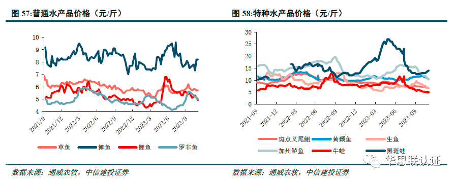 水产养殖行业面临较大库存去化压力,叠加消费相对低迷以及其他肉类蛋白价格整体偏低等因素影响,草鱼、罗非鱼等普通水产品价格表现较为低迷。四季度为传统出鱼时点,受终端市场支撑不足影响,普通水产品流通依旧缓慢,大量成鱼达上市规格,但销量受阻,价格整体表现较为低迷。特种水产品方面,生鱼、牛蛙、加州鲈鱼等品种因供给增加以及需求较弱等因素影响,年初至今均价低于去年同期。