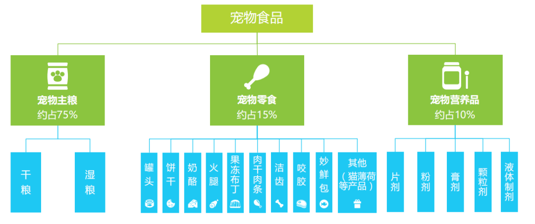 宠物食品以其形态、功能和营养成分可区分为宠物主粮、宠物零食及宠物营养品三大类。具体细分产品如下: