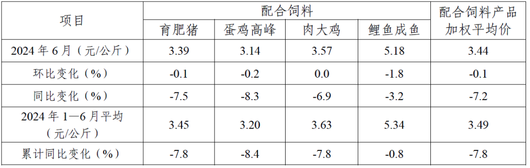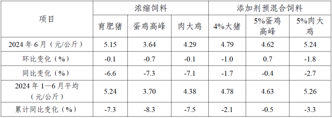 表3 2024年6月饲料企业浓缩饲料和添加剂预混合饲料平均价格