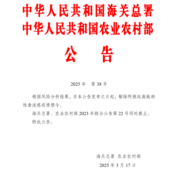 近日,海关总署发布了,海关总署 农业农村部公告2025年第38号(关于解除阿根廷高致病性禽流感疫情禁令的公告)。